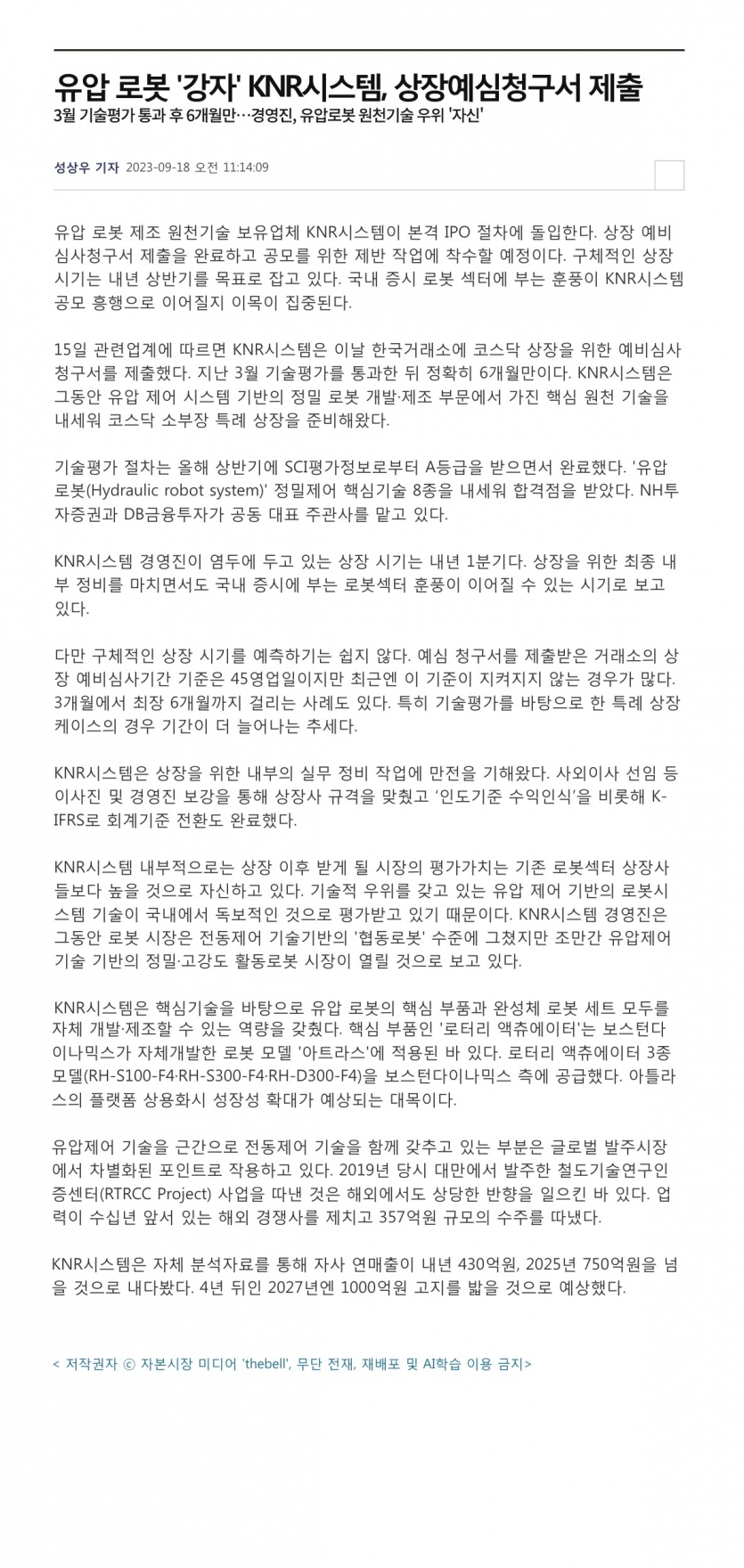 2023.09.18_[더벨] 유압로봇'강자'KNR시스템,상장예심청구서제출