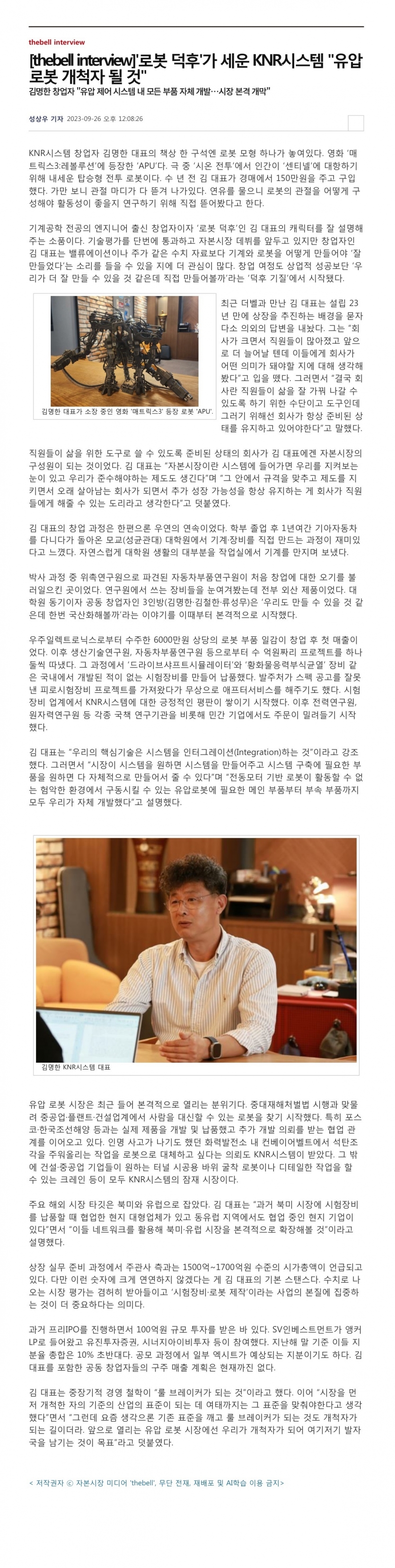 2023.09.26_[더벨] '로봇 덕후'가 세운 KNR시스템 "유압 로봇 개척자 될 것" 페이지 정보 작성자 관리자 댓글 0건 조회 592회 작성일 23-10-27 15:51 목록 본문 2023.09.26 관련링크 https://www.thebell.co.kr/free/content/ArticleView.asp?key=20230925154… 279회 연결 다음글2023.09.20_[더벨] DB금투, 케이엔알시스템 주관사단 합류 배경은 23.10.27