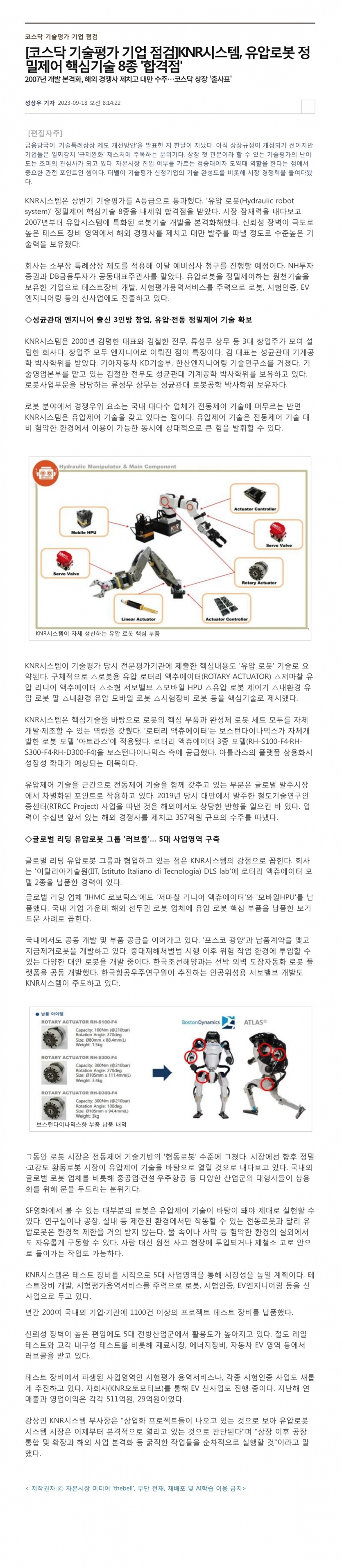 2023.09.18_[더벨] KNR시스템, 유압로봇 정밀제어 핵심기술 8종 '합격점' 페이지 정보 작성자 관리자 댓글 0건 조회 239회 작성일 23-10-23 09:08 목록 본문 2023.09.18 관련링크 https://www.thebell.co.kr/free/content/ArticleView.asp?key=20230914154… 128회 연결 이전글2023.09.18_[더벨] 유압로봇'강자'KNR시스템,상장예심청구서제출 23.10.27 다음글[공지] 케이엔알시스템 홈페이지 리뉴얼 오픈 22.10.03