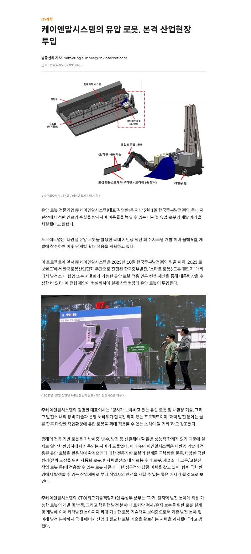 2024.05.07_[매일경제] 케이엔알시스템의 유압 로봇, 본격 산업현장 투입 페이지 정보 작성자 관리자 댓글 0건 조회 249회 작성일 24-05-14 09:38 목록 본문 2024.05.07 관련링크 https://www.mk.co.kr/news/it/11006764 680회 연결 이전글2024.05.07_[이데일리] 케이엔알시스템, 석탄연료 손실 방지 가능한 '다관절 유압로봇' 개발계약 체결 24.05.14 다음글2024.03.07_[연합뉴스] [특징주] 케이엔알시스템, 코스닥 상장 첫날 공모가 2.3배 24.03.12