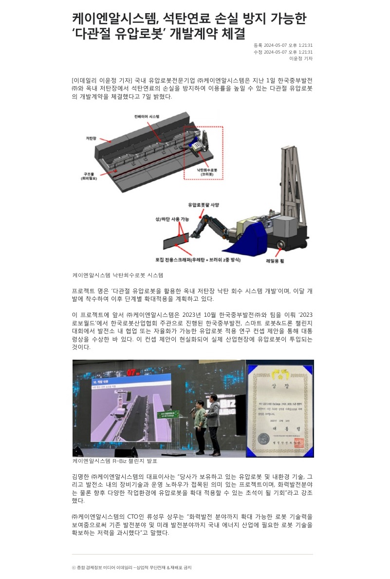 2024.05.07_[이데일리] 케이엔알시스템, 석탄연료 손실 방지 가능한 '다관절 유압로봇' 개발계약 체결 페이지 정보 작성자 관리자 댓글 0건 조회 281회 작성일 24-05-14 10:05 목록 본문 2024.05.07 관련링크 https://www.edaily.co.kr/news/read?newsId=02574806638886624&mediaCodeN… 669회 연결 이전글2024.05.07_[한국경제] 케이엔알시스템의 유압로봇, 산업현장 투입...단계별 확대 적용 24.05.14 다음글2024.05.07_[매일경제] 케이엔알시스템의 유압 로봇, 본격 산업현장 투입 24.05.14