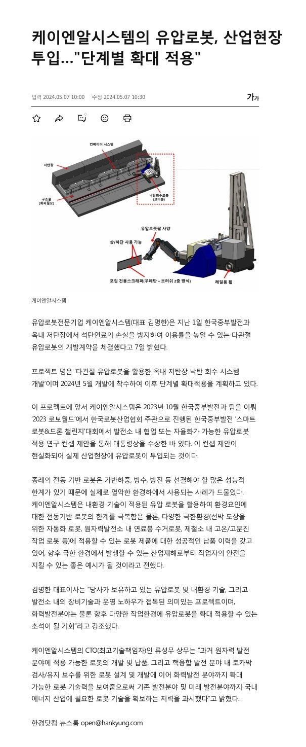 2024.05.07_[한국경제] 케이엔알시스템의 유압로봇, 산업현장 투입...단계별 확대 적용 페이지 정보 작성자 관리자 댓글 0건 조회 399회 작성일 24-05-14 10:25 목록 본문 2024.05.07 관련링크 https://www.hankyung.com/article/202405035073O 362회 연결 이전글2024.06.20_[이데일리] 케이엔알시스템, 서울과기대 대학원과 AI 유압로봇 공동개발 협력 24.06.20 다음글2024.05.07_[이데일리] 케이엔알시스템, 석탄연료 손실 방지 가능한 '다관절 유압로봇' 개발계약 체결 24.05.14