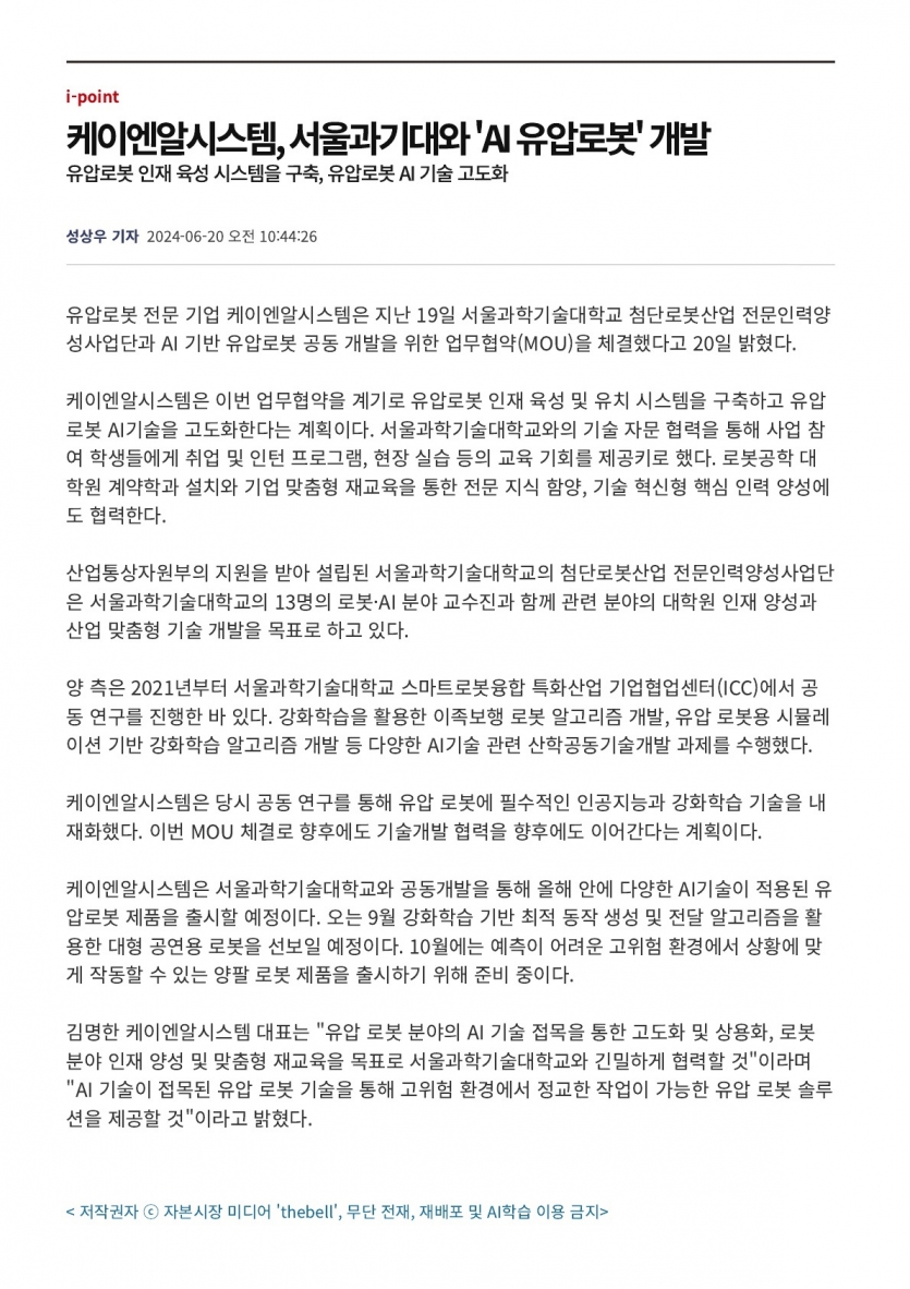 2024.06.20_[더벨] 케이엔알시스템, 서울과기대와 'AI 유압로봇' 개발 페이지 정보 작성자 관리자 댓글 0건 조회 349회 작성일 24-06-20 15:58 목록 본문 2024.06.20 관련링크 https://www.thebell.co.kr/free/content/ArticleView.asp?key=20240620102… 140회 연결 이전글2024.07.29_[이데일리] 케이엔알시스템, 포스코이앤씨와 건설로봇 개발·적용 MOU 체결 24.07.29 다음글2024.06.20_[이데일리] 케이엔알시스템, 서울과기대 대학원과 AI 유압로봇 공동개발 협력 24.06.20