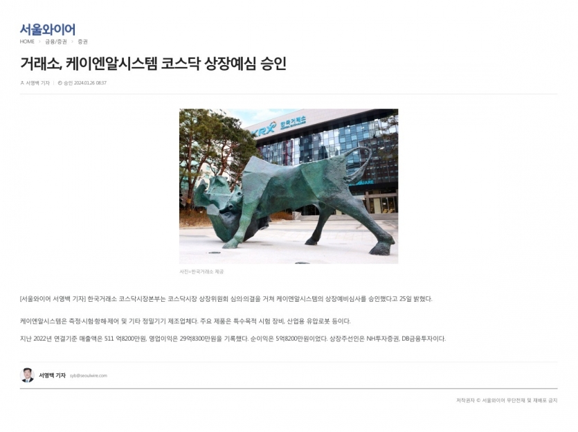 2024.01.26_[서울와이어] 거래소, 케이엔알시스템 코스닥 상장예심 승인 페이지 정보 작성자 관리자 댓글 0건 조회 359회 작성일 24-01-26 11:38 목록 본문 2024.01.26 이전글2024.01.26_[뉴스웰] 유압 로봇 만드는 ‘케이엔알시스템’ 코스닥 상장 첫 관문 통과 24.01.26