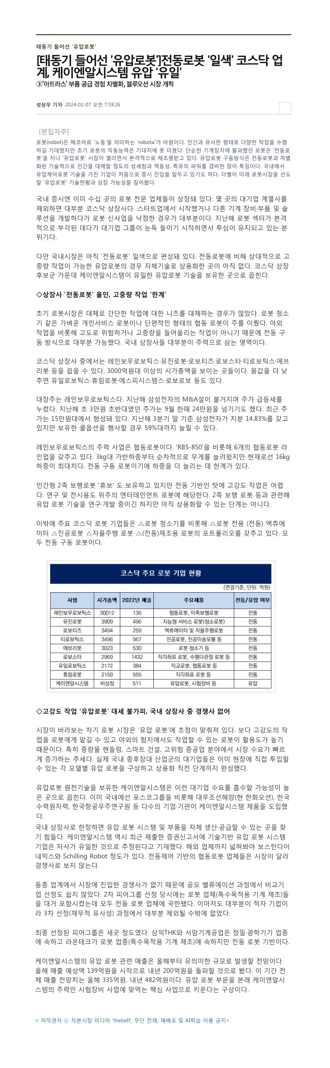 2024.02.07_[더벨] 전동로봇 '일색' 코스닥 업계, 케이엔알시스템 유압 '유일'