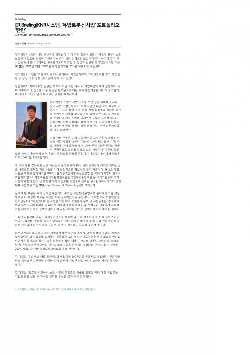 2024.02.23_[더벨] KNR시스템, ‘유압로봇·신사업’ 포트폴리오 ‘탄탄’