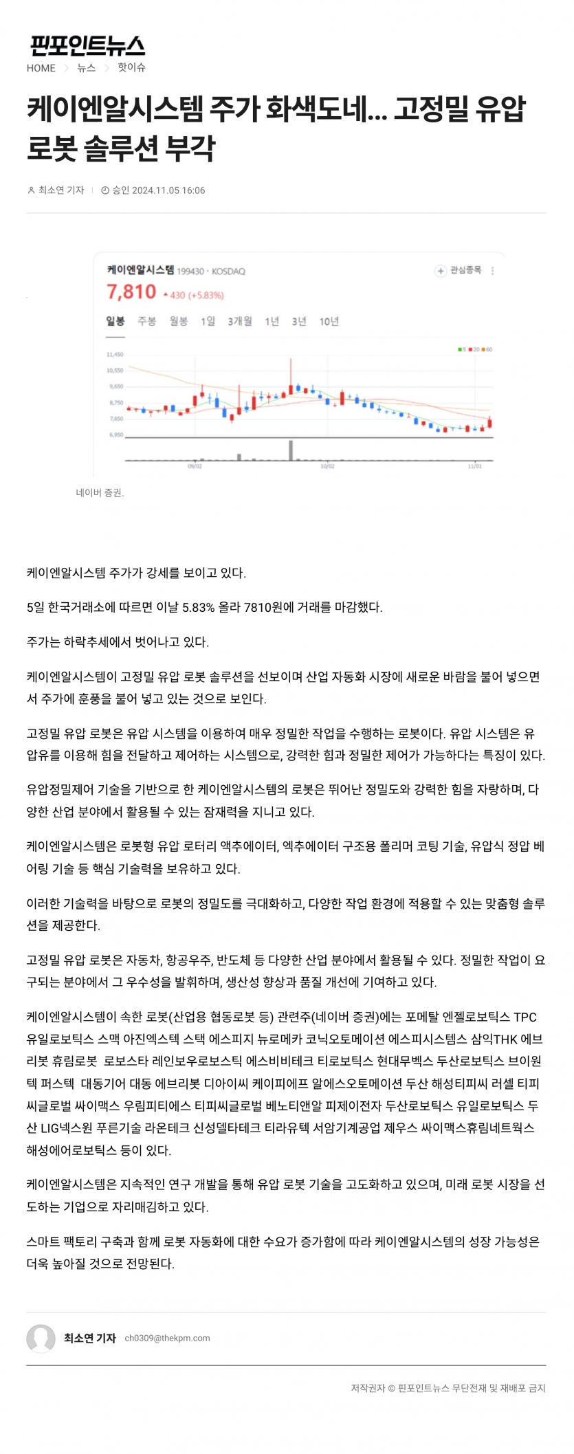 2024.11.05_[핀포인트뉴스] 케이엔알시스템 주가 화색도네...고정밀 유압 로봇 솔루션 부각 페이지 정보 작성자 관리자 댓글 0건 조회 262회 작성일 24-12-05 14:31 목록 본문 2024.11.05 관련링크 https://www.pinpointnews.co.kr/news/articleView.html?idxno=297523 181회 연결 이전글2024.12.02_[뉴시스] 케이엔알시스템_LG화학과 화확 공정 자동화 시스템 개발 계약 24.12.05 다음글2024.10.28_[로봇기술] [2024 로보월드] 케이엔알시스템, 고정밀 유압 로봇 솔루션 소개 24.11.07