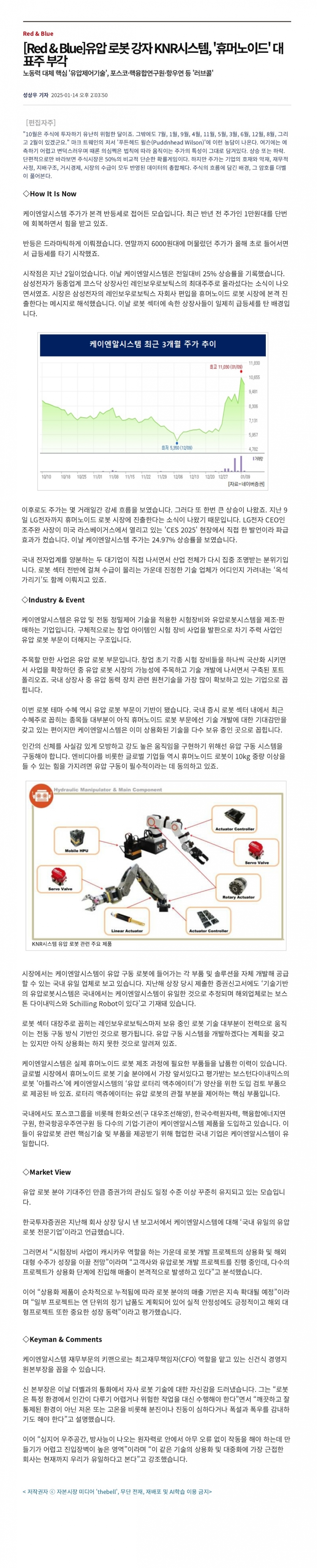 2025.01.14_[더벨] 유압로봇강자 KNR시스템, '휴머노이드' 대표주 부각 페이지 정보 작성자 관리자 댓글 0건 조회 134회 작성일 25-01-14 16:08 목록 본문 2025.01.14 관련링크 https://www.thebell.co.kr/free/content/ArticleView.asp?key=20250110142… 33회 연결 이전글2025.01.16_[핀포인트뉴스] 케이엔알시스템 주가 날개...유압로봇 하드웨어와 소프트웨어 기술 내재화 부각 25.01.17 다음글2025.01.07_[이데일리] 케이엔알시스템, 핵융합 장치 원격 유지보수 로봇 개발 계약 체결 25.02.07