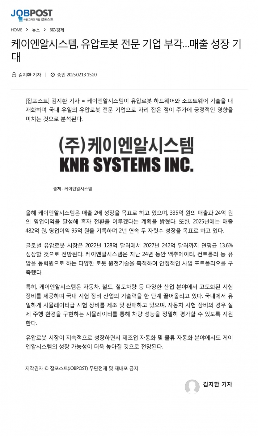 2025.02.13_[잡포스트] 케이엔알시스템, 유압로봇 전문 기업 부각...매출 성장 기대 페이지 정보 작성자 관리자 댓글 0건 조회 85회 작성일 25-02-14 08:55 목록 본문 2025.02.13 관련링크 https://www.job-post.co.kr/news/articleView.html?idxno=126470 47회 연결 이전글[공지] 본사 이전안내 25.04.16 다음글202502.07_[딜사이트] [로봇사업 기대株] '현대차 동행' KNR시스템, '유압로봇' 속도낸다 25.02.10