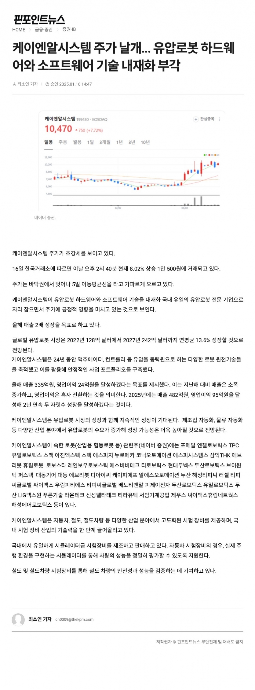 2025.01.16_[핀포인트뉴스] 케이엔알시스템 주가 날개...유압로봇 하드웨어와 소프트웨어 기술 내재화 부각 페이지 정보 작성자 관리자 댓글 0건 조회 112회 작성일 25-01-17 10:21 목록 본문 2025.01.16 관련링크 https://www.pinpointnews.co.kr/news/articleView.html?idxno=314053 46회 연결 이전글2025.02.03_[더벨] '유압로봇' 케이엔알시스템, 맞춤형 양산체제 진입 25.02.04 다음글2025.01.14_[더벨] 유압로봇강자 KNR시스템, '휴머노이드' 대표주 부각 25.01.14