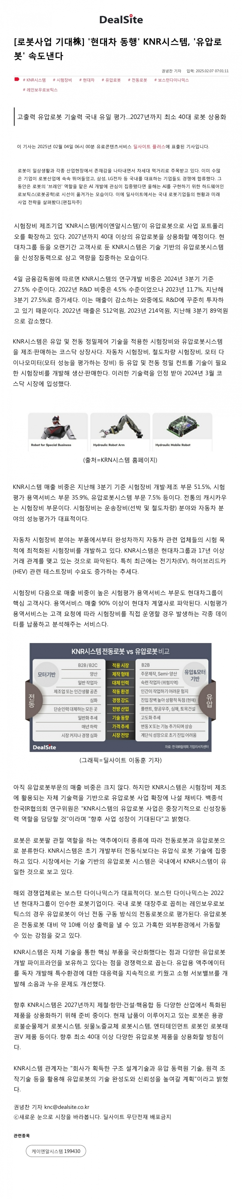 202502.07_[딜사이트] [로봇사업 기대株] '현대차 동행' KNR시스템, '유압로봇' 속도낸다 페이지 정보 작성자 관리자 댓글 0건 조회 95회 작성일 25-02-10 10:13 목록 본문 202502.07 관련링크 https://dealsite.co.kr/articles/135730 28회 연결 이전글2025.02.13_[잡포스트] 케이엔알시스템, 유압로봇 전문 기업 부각...매출 성장 기대 25.02.14 다음글2025.02.03_[더벨] 케이엔알시스템 “유압로봇 개화기, 시장 클 수밖에 없다” 25.02.04