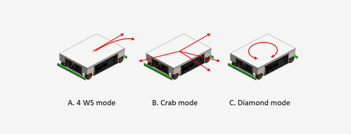 - 4WS mode : 4개 휠에 대한 독립적인 조향 제어가 가능하여 차량의 회전 곡률 반경과 곡률 중심점 위치를 자유롭게 조정할 수 있어
